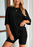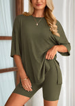 “I bought this two piece set for my trip last month and wore it on the plane — I’ve never been so comfortable while still looking put-together! The fabric is super soft, lightweight, and breathable. The oversized shirt drapes perfectly, and the biker shorts stay in place without digging in. I’ve already worn it for errands and lazy Sundays at home. Definitely ordering more colors!”